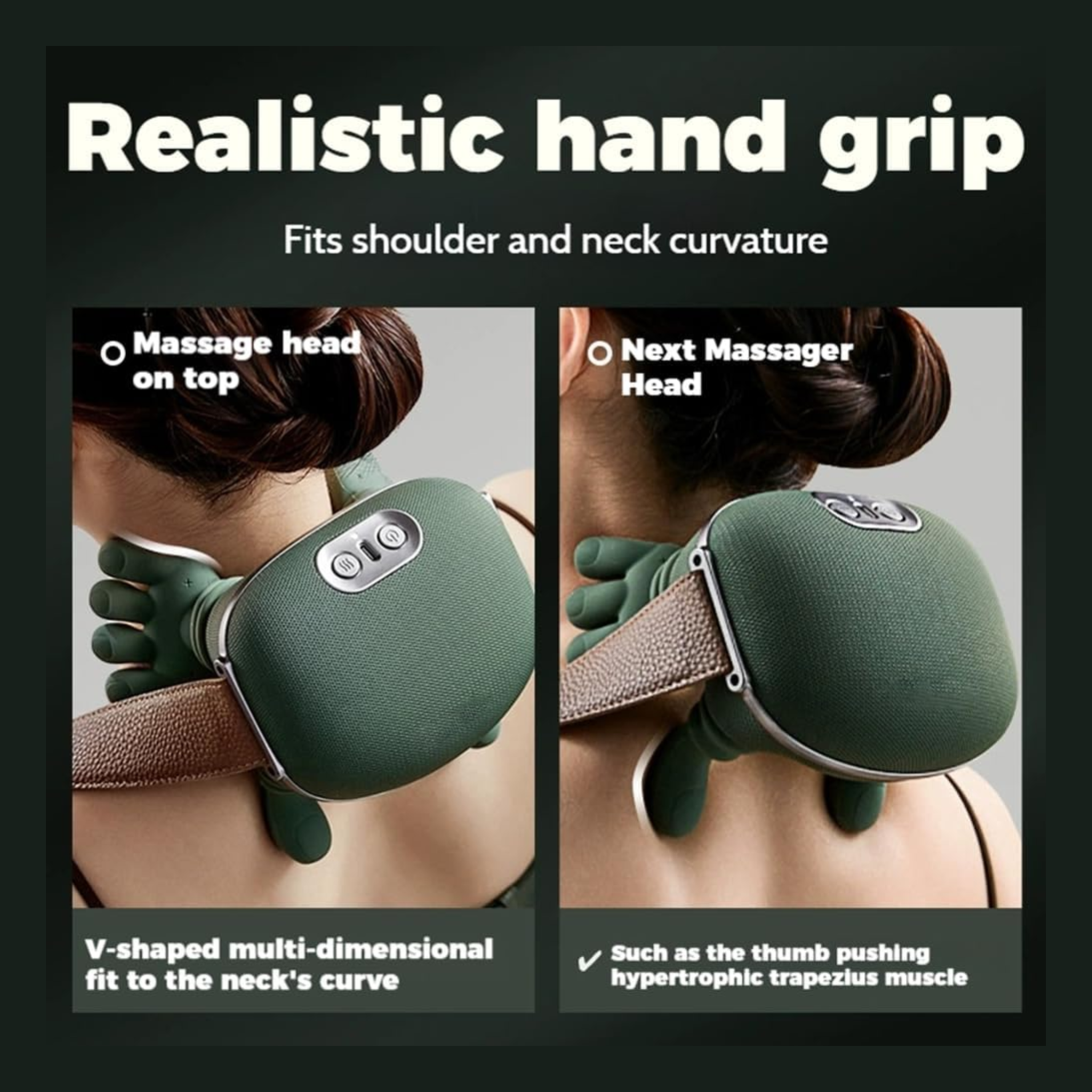 The massager simulates real hands with 4 fingers for the neck and a thumb for the trapezius muscles. It kneads and relieves tension while providing a relaxing massage.